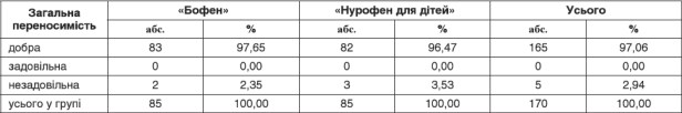 - Загальна переносимість препаратів «Бофен» та «Нурофен для дітей» була доброю у 97,65% дітей, що дає змогу віднести їх до групи високотолерантних препаратів.